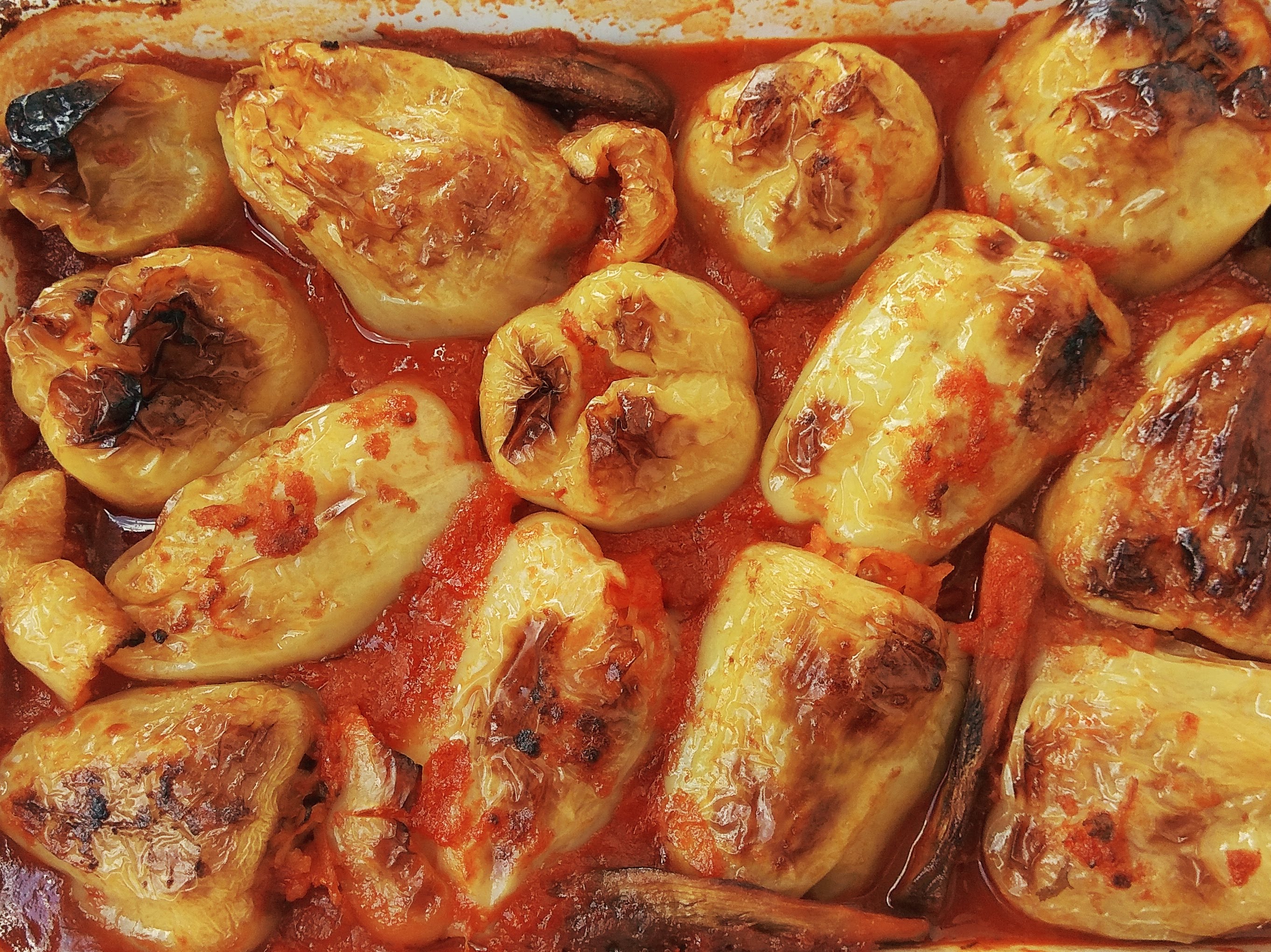 Pećnicu ugrijte na 200 stupnjeva, posudu pokrijte aluminijskom folijom i stavite peći 40 minuta. Nakon 40 minuta otkrijte foliju da se gornji sloj paprika dodatno zapeče i pecite još 20-30 minuta, ovisno o jačini pećnice. Tijekom pečenja okrenite jednom paprike kako bi se zapekle sa obje strane.
