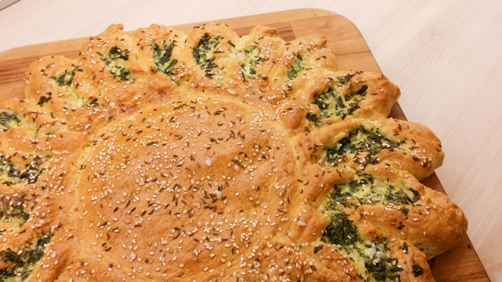Nakon što smo napravili cijeli krug, maknemo okruglu posudu. Pogaču namažemo razmućenim jajetom, i pospemo je sezamom i kimom i ako imamo možemo posipati i krupnu morsku sol. Pogaču pečemo na 180° 35 minuta.